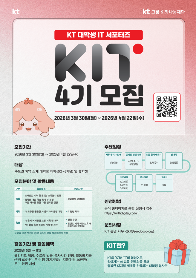 KT 대학생 IT 서포터즈 KIT는 KT의 ‘K’와 ‘IT’를 결합한 이름으로,